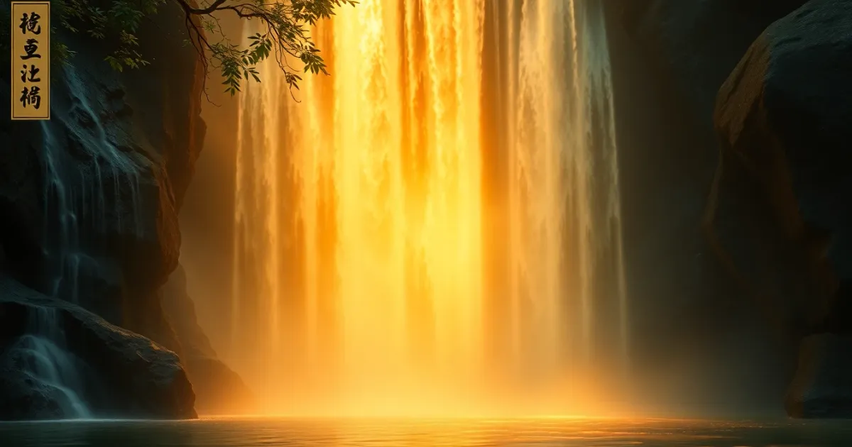 The golden glow of sunlight on a waterfall, representing energy and vitality.
