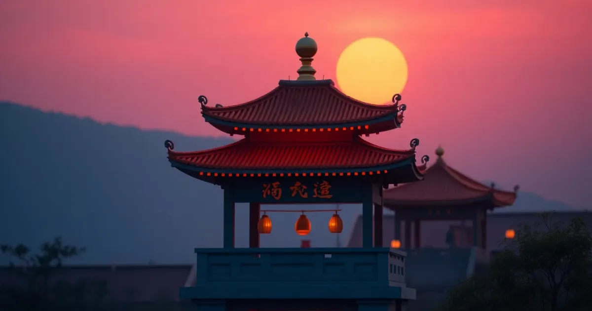 The warm glow of Buddhist temple bells at dusk, representing spiritual resonance.